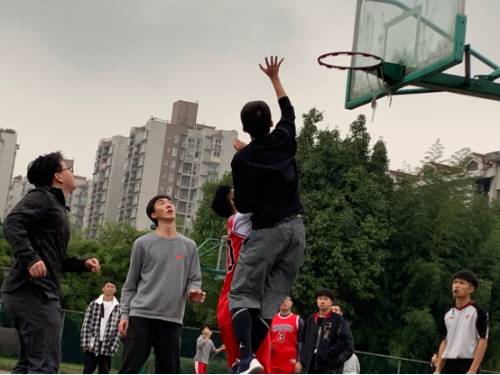在后半场比赛时天空突然下起了小雨。清凉沁骨的雨水打在篮球场的塑胶地上,积攒出一个个小小的水洼。突然,一位19级的同学在落地时脚滑摔倒了。大家立马停下比赛,将同学送到一旁。在短暂商议之后大家决定中止本次比赛,改天继续进行。这时学长们却宣布退出本次比赛。其中一位学长说:“这次比赛主要是我们想打篮球,所以才来打的”,学长们并不想比出胜负,只是为了锻炼身体和学业之余进行娱乐,他们也主动放弃了比赛的成绩。