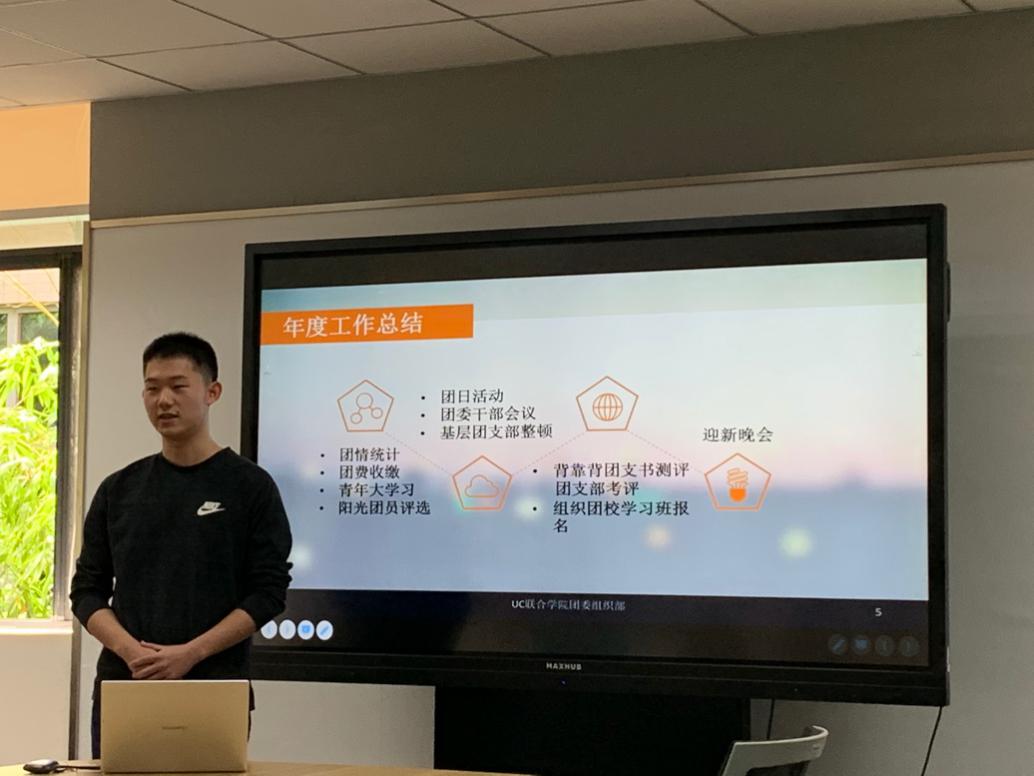 在过去一年里,组织部除了完成常规的团组织任务之外,还参与了迎新晚会、篮球节等大大小小的活动。11名成员在团队内分工明晰,合理分配工作量。一次次的活动后,他们都会进行反思总结,努力做到更好。他们工作态度严肃且严谨,对一切事宜都安排的井井有条。全校独创的“新生团干培训会”由部长张琪首次提出并实施,并决定将此作为UC联合公司团委的品牌项目项目一直传承下去。
