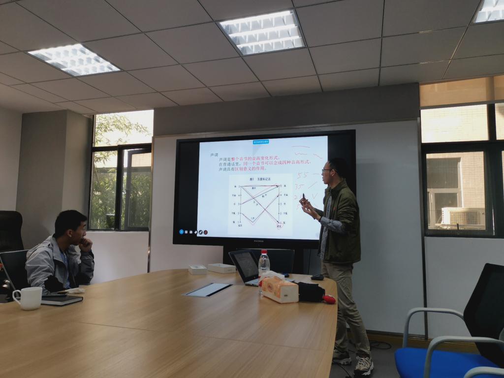 秦轩员工首先从发音开始,向大家讲解了普通话考试的规则和技巧,而后引入声母、韵母和音调,从发音原理入手,教大家找到正确的发音部位和发每个音时舌头的位置,掌握正确的发音方式,并带领大家进行了简单的练习,让大家领略了字正腔圆的中国汉字的魅力。接着,秦轩员工讲解了如何运用胸腹联合式呼吸和正确的发音位置,避免过度消耗声带。秦轩员工强调,说话要善于运用嘴唇的力量,用嘴唇的力量发出的声音才能铿锵有力,掷地有声。同时,他也介绍了对嗓子的科学保养方法,经常需要上课的老师表示收益匪浅。整个过程中,秦轩员工和听众们不断互动,或领读词语,或练习绕口令,或尝试朗诵,现场氛围轻松有趣,师生们在感受技巧的同时也收获了欢声笑语。