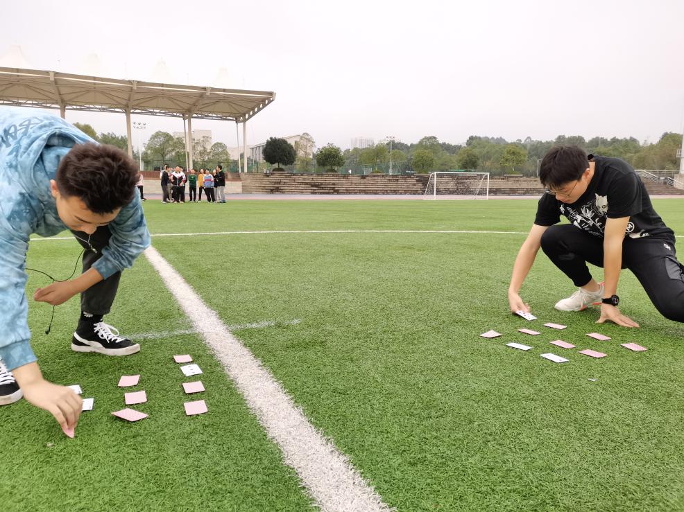 第二项运动叫做记忆游戏,配合和记忆的智慧就藏于十张扑克牌点数的排列当中。经历了几次失误后,两队队员很快掌握了游戏的精髓,在拼速度的情况下,加强团队配合,两队最终都成功完成了任务。大家在游戏中既锻炼了自己,也娱乐了身心。同学们火热的心为深秋萧瑟的环境增添了几分活力。