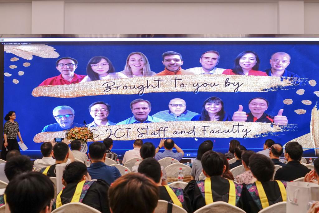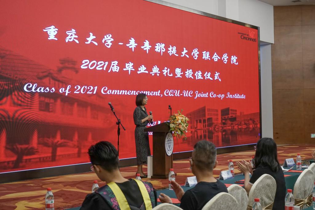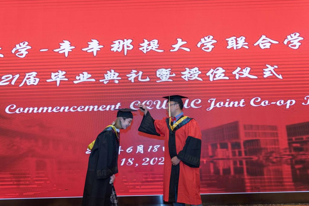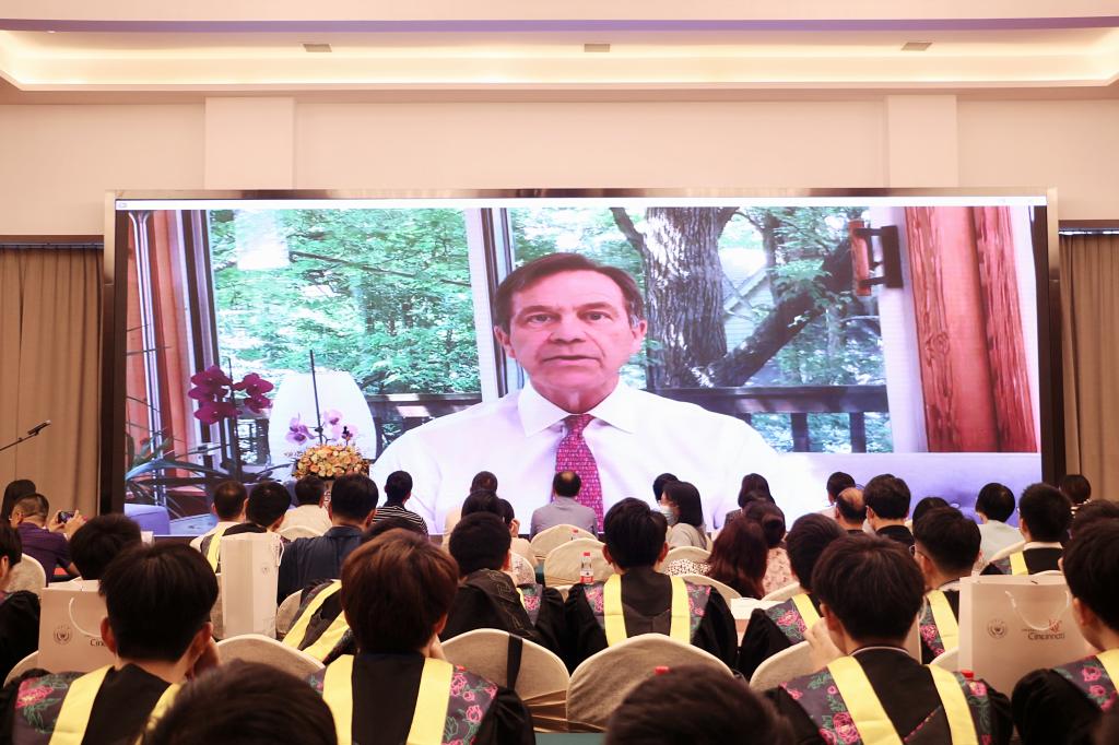 由于疫情原因,远在海外的美方老师无法到达毕业现场,他们把对毕业生的祝愿录制成视频送到了会场。美方经理Thomas Huston在视频中向获得美方优等学位荣誉的同学们表达了祝贺,欢迎同学们将来去到辛辛那提大学参观,也祝愿毕业生们未来在自己的领域绽放光芒,在前沿领域发光发热。美方教师们也通过视频,纷纷为毕业生送上最衷心的祝愿。