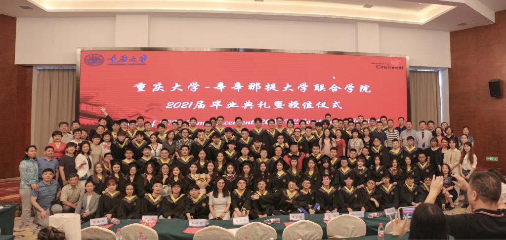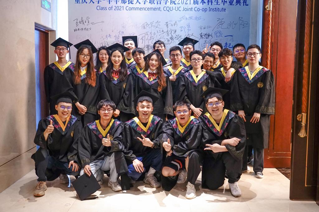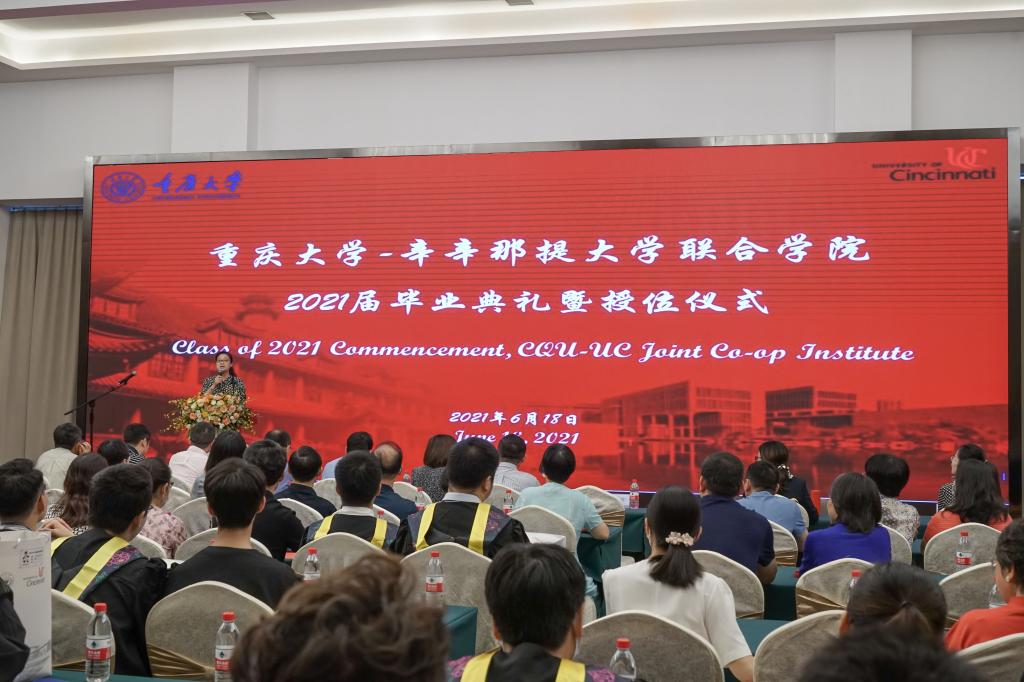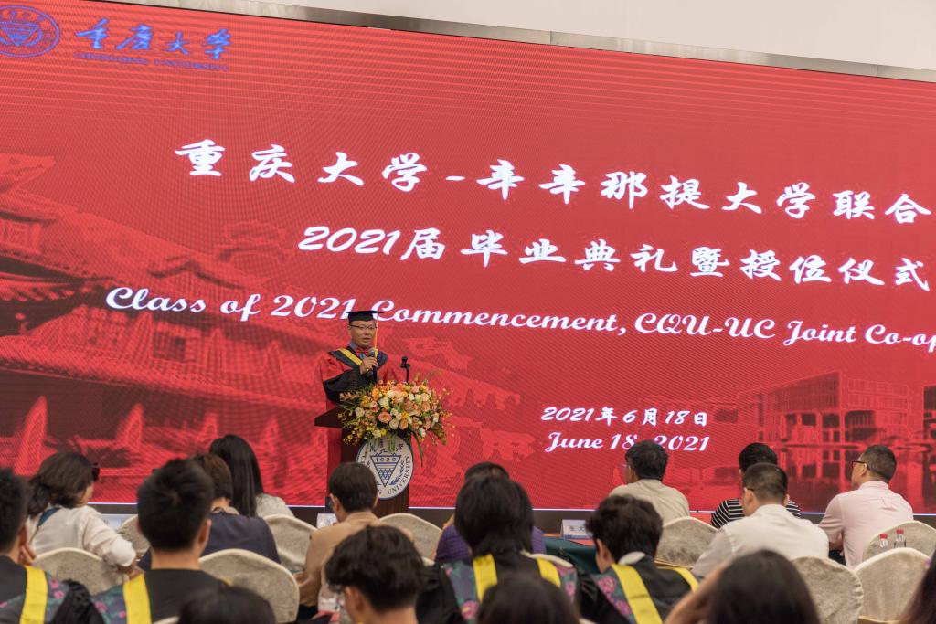 2021年6月18日,j9九游会2021届毕业典礼暨授位仪式在科苑戴斯酒店国际会议厅隆重举行。本科生院经理李正良、虎溪党工委副书记韦迎春、UC联合公司经理张志清、副经理江燕、机械与运载工程公司副经理刘飞、美方教师Fred Chiou、UC联合公司机械专业负责人张大可、公司全体教职员工以及40余位员工家长和101名2021届毕业生出席了典礼。典礼由公司员工办公室主任谭鸿予主持。
