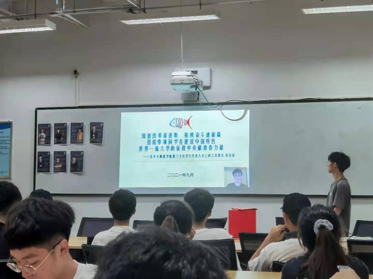 晚7点,大会在奏唱国歌中拉开帷幕。院员工会轮值主席陈一夫宣读了校员工会对会议启动的同意批复。随后,2020届员工会主席易弘睿代表上届员工会做工作报告,总结了院员工会这一年所做工作,以及在促进同学们德育、智育、体育、美育、劳育等各个方面取得的成绩。易弘睿同学在报告中提到:员工会一定要维护好员工的正当权益,恪守员工工作的根本——更好地服务同学;要继续深化学联员工会改革,为广老员工营造一个更好的成长平台,当好同学们的‘服务员’。