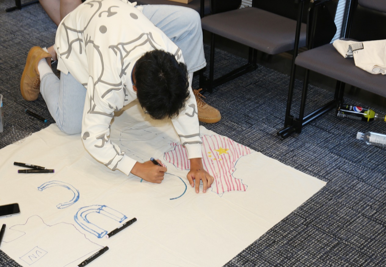 最后,为了帮助新同学们更好地认识、熟悉彼此,在迎新志愿者同学SOLS的带领下,进行了“flag activities”破冰活动。大家分为10个小组,尽情地发挥自己的创造力和动手能力,绘制各自小组的旗帜。各组绘制完毕后,依次上台展示和解读。同学们的奇思妙想和精湛的画意牢牢吸引住在场的每一个人,会场气氛达到了高潮。