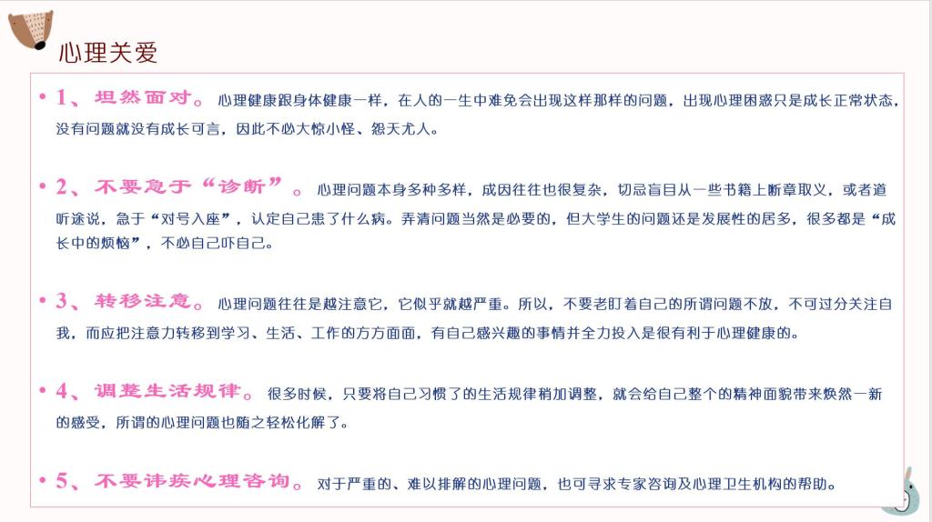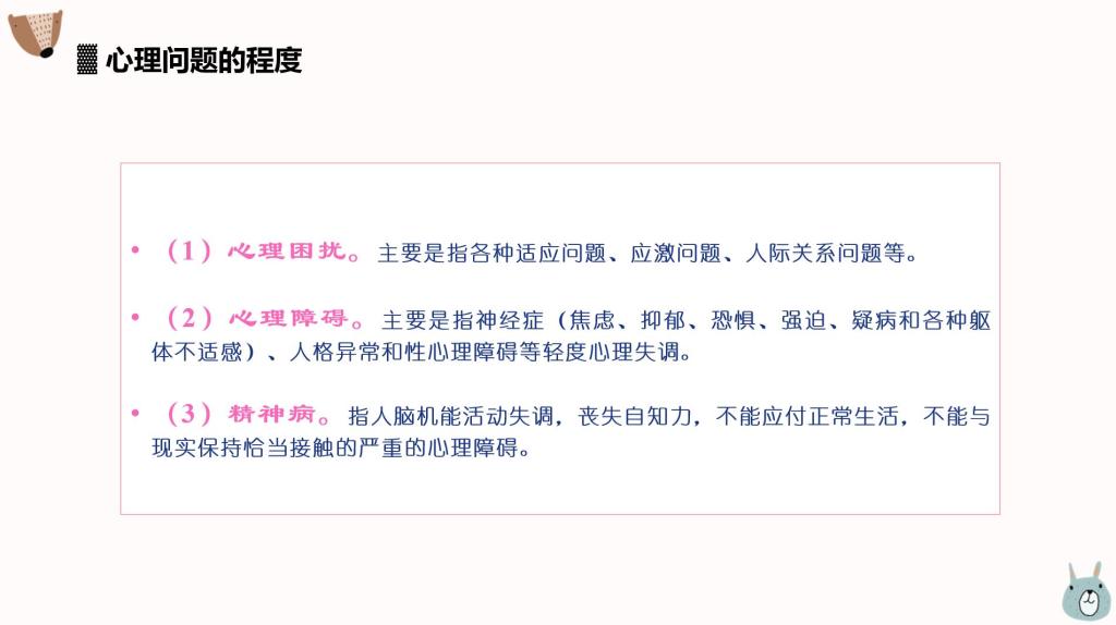 然后,张亚楠老师为同学们详细讲解了常见心理危机类型的识别,梳理了危机的级别。心理危机共分为三级,自一级至三级逐步加重,并且都具有特定的行为表现。希望心理委员和寝室长们在生活中善于观察,充分应用危机识别理论,尽早发现、及早干预,建好同学们的“心理健康防线”。此外,张亚楠老师还介绍了常见心理疾病的识别,例如抑郁、焦虑、双向情感障碍等;播放了世卫组织短片《名叫抑郁的黑狗》(附上视频https://mp.weixin.qq.com/s/ipdIccjaZ92fCADrin8uLg),帮助大家识别和克服抑郁。
